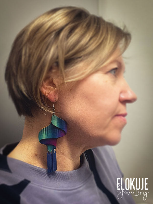 Loimu #2 on Elokujeen uuden Aurora-sarjan toinen isompi ja värikkäämpi korvakorupari – siinä loistaa kaikki revontulien upeat värit poronnahkahapsuja myöten.