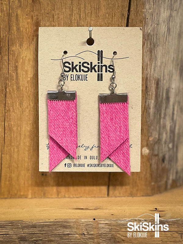 Käytetystä pinkistä Pomoca-nousukarvasta eli skinistä käsin valmistetut korvakorut. Pituus n. 6 cm. Koruosat ruostumatonta terästä.