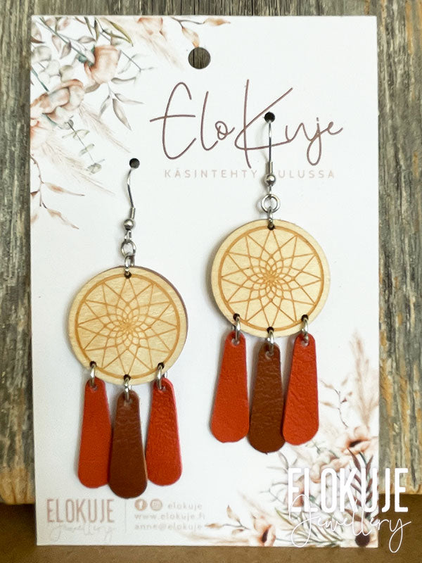 Kotimaisista ylijäämäporonnahkapalasista ja koivuvanerista käsin tehdyt korvakorut. Idean malliin olen saanut unisieppareista.